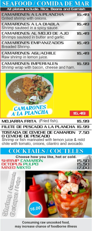 HOME  OPENING  HOURS MENU TACOS Y BURRITOS GOOD MORNING AGUAS FRESCAS VEGETARIANS SEAFOOD SPECIALTIES PLATES